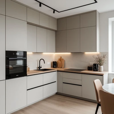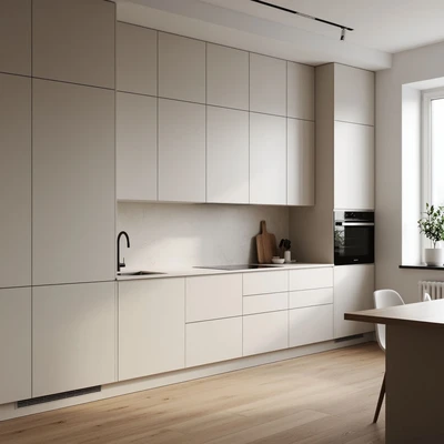 Мы предложили декоративную оклейку фасадов в современную матовую текстуру с нейтральным оттенком. Это позволило полностью изменить восприятие кухни без замены мебели.